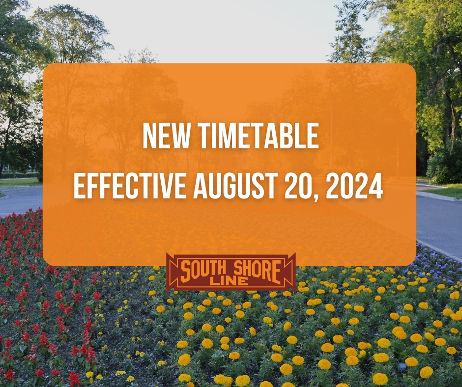 Passengers are advised the South Shore Line will implement a new train schedule, effective Tuesday, Aug. 20, 2024. Please click here to view the full schedule of train times.